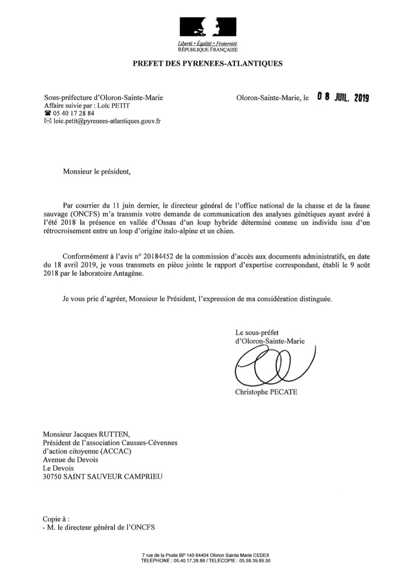 confirmé par la lettre de l'ONCFS du 23 février