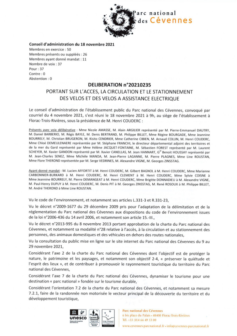 Sans concertation préalable, le Parc national des Cévennes a pris la décision dinterdire le VTT sur différents sentiers en cur de parc par un arrêté préfectoral datant du 10 juillet 2017. En résumé, le parc souhaite interdire la pratique du VTT à cause dune érosion des sentiers et dans le but de protéger des espèces fragiles de rapaces.