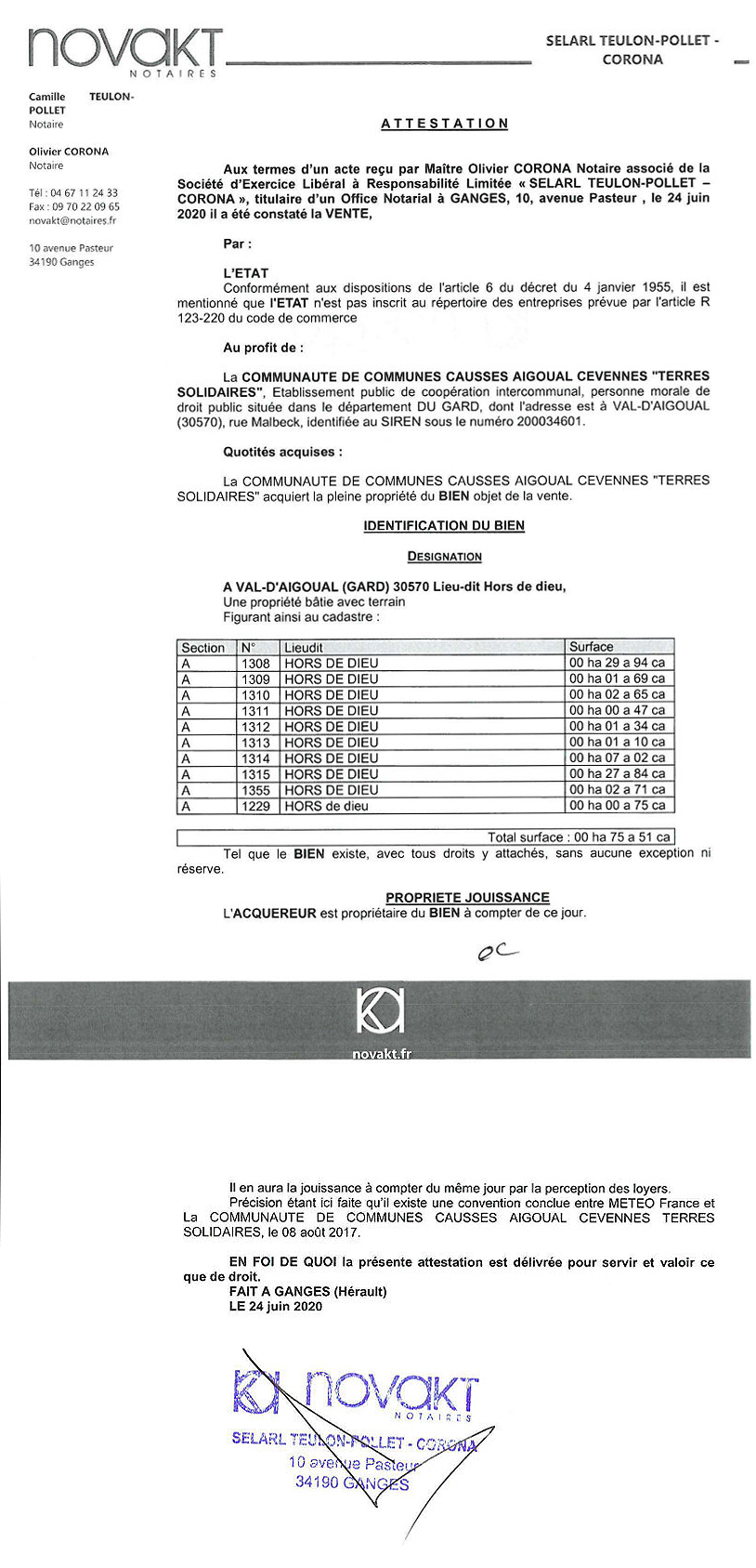 L'Observatoire est propriété de France Domaine, le restaurant et les gîtes seraient propriètè de la mairie de Valleraugue, rien n'appartient à la communauté de communes Causses Aigoual Cévennes Terres Solidaires.