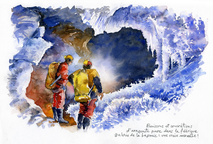 Après nous avoir présenté le terroir et ses paysages, Alain Marc nous entraîne vers les profondeurs de la terre, nous livrant un récit minutieux de ses différentes descentes, en compagnie de son ami Roland Pélissier, le suivant sans trop de peine dans le dédale souterrain grâce à son expérience antérieure de spéléologue Le 22 novembre 2006, il descend pour la première fois dans le faisceau de lumière qui se projette à partir de lentrée sur le fond de la Fosse aux Ours et parcourt les galeries jusquà la « fissure de lespoir », franchissant le barrage de trappes et câbles pour accéder aux nouveaux réseaux, au delà du « couloir de la déception passagère ». Plusieurs camps de base y sont déjà aménagés, permettant de rayonner dans la multiplicité des galeries aux noms évocateurs (ainsi a pu les dénommer Roland Pélissier ), comme, entre autres, le Tube du printemps, la Galerie de la Laponie, La Monte, en hommage à des équipiers millavois (appellation qui ne correspond pas vraiment, comme Alain Marc lindique, au Boulevard du Crès à Millau, mais plutôt à lavenue de la République où la jeunesse millavoise avait autrefois lhabitude de « faire la monte »), la Salle blanche, le Palais des Glaces Nous le suivons dans ses différentes descentes durant lannée 2007, grâce à son récit et à ses aquarelles et dessins, parcourant les différents réseaux Macary-Pélissier (« Maud au pays des merveilles », « réseau des quatre Pierre », « réseau des Sans Patrick » ), jusquau « Complexe labyrinthique Jean-Sébastien Marc-Carrière » (ainsi nommé par Roland Pélissier en souvenir du fils disparu dAlain Marc, auquel louvrage est dailleurs dédié ). Le voici dormant dans les divers camps de base à lintérieur de son duvet glacé, admirant et nous restituant la splendeur des concrétions (aragonites en buisson, en excentriques, en inflorescences de givre, en décor glacé sur les parois ), découvrant les écoulements et les vasques superposées, comme celles des « Lacounets », croquant des scènes insolites, comme celle de Roland Pélissier en train de nettoyer des salissures dans le « Palais des Glaces » En décembre 2007 hélas, interruption de laventure, à cause dune mauvaise chute, non pas sous terre, mais à lextérieur, au cours dune marche de reconnaissance dans les gorges du Trévezel Ces mois vont toutefois lui permettre de profiter de la splendeur estivale du causse et dun automne flamboyant, ce qui nous offre de remarquables croquis de paysages, de détails de végétation, doiseaux, dinsectes, observables dans ce recoin des Grands Causses au contact des Cévennes qui est lhabitat despèces endémiques Lensemble de ces reconnaissances sappuie sur un imposant corpus de cartes tout aussi remarquables, dessinées à la main, tant des réseaux souterrains que des lieux alentours.